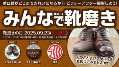 革靴好き必見!第3回となる革靴イベントオフ会 みんなでゆる〜く靴磨きを開催。靴磨きレクチャーやUSED革靴相談もあり、YouTubeやSNSで人気の「くつざんまい」「巡」さんと共にZAKINGが参戦。参加方法や持ち物、リアルで学べる魅力を紹介。